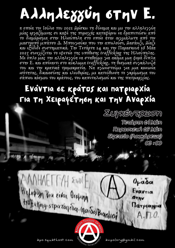 Να σταθούμε απέναντι στο κύκλωμα trafficking, τη θεσμική του συγκάλυψη και την κρατική τρομοκρατία. Να αγωνιστούμε για μια κοινωνία ισότητας, δικαιοσύνης και ελευθερίας, με κατεύθυνση το γκρέμισμα του σάπιου κόσμου του κράτους, του καπιταλισμού και της πατριαρχίας