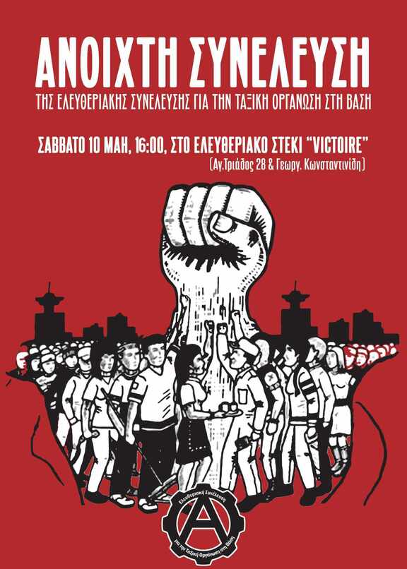 Επόμενη Ανοιχτή Διαδικασία της Ελευθεριακής Συνέλευσης για την Ταξική Οργάνωση στη Βάση, Σάββατο 10 Μάη στις 16:00 στο Ελευθεριακό Στέκι Victoire (Αγ. Τριάδος 28 με Γ. Κωνσταντινίδη, Φάληρο)