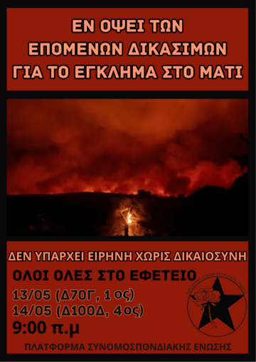Η υπόθεση της φονικής πυρκαγιάς στο Μάτι τον Ιούλιο του 2018 εκδικάζεται σε δεύτερο βαθμό, όπου θα κριθεί και θα τελεσιδικήσει η εγκληματική και κακουργηματική ευθύνη μερικών εκ των υπεύθυνων του τραγικού αυτού κρατικού καπιταλιστικού εγκλήματος.