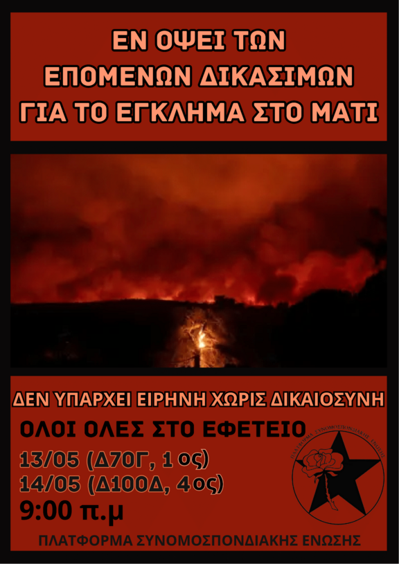 Η υπόθεση της φονικής πυρκαγιάς στο Μάτι τον Ιούλιο του 2018 εκδικάζεται σε δεύτερο βαθμό, όπου θα κριθεί και θα τελεσιδικήσει η εγκληματική και κακουργηματική ευθύνη μερικών εκ των υπεύθυνων του τραγικού αυτού κρατικού καπιταλιστικού εγκλήματος.