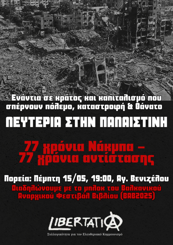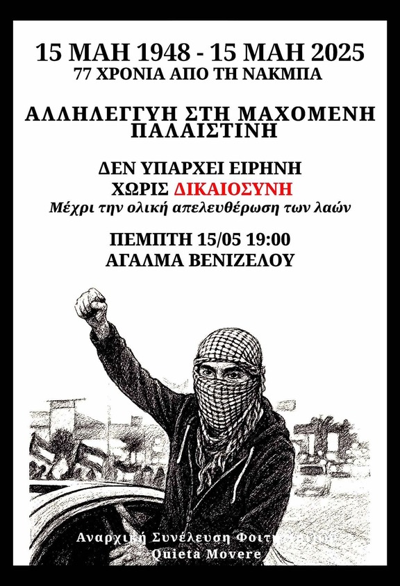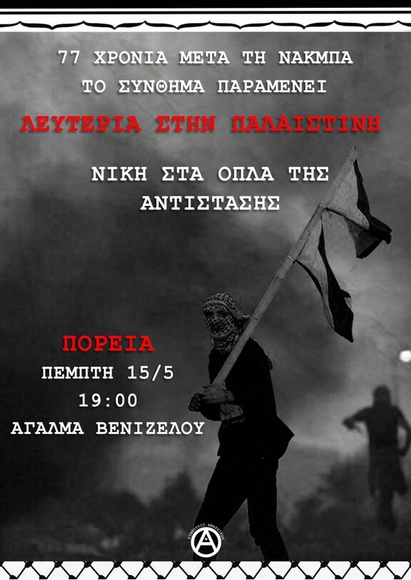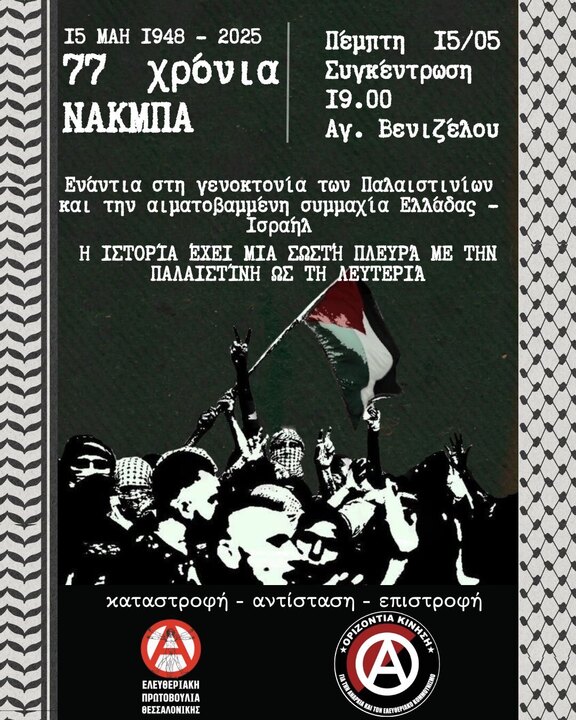 Επ' αφορμή των 77 χρόνων από τη Νάκμπα, της συνεχιζόμενης γενοκτονίας του παλαιστινιακού λαού και της ηρωικής του αντίστασης, ο Διαρκής Αγώνας για την ταξική απελευθέρωση, καλεί σε αντιιμπεριαλιστικές διαδηλώσεις αλληλεγγύης στην Παλαιστίνη σε Αθήνα και Θεσσαλονίκη. Στην Αθήνα, η διαδήλωση καλείται για τις 17/5 στις 13:30 στο Πάρκο Ελευθερίας, ενώ στη Θεσσαλονίκη θα πραγματοποιηθεί στις 15/5 στις 19:00, στο Άγαλμα Βενιζέλου.