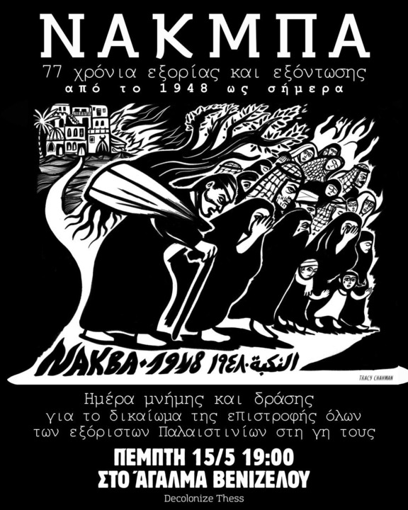Στις 15 Μάη Παλαιστίνιοι και Παλαιστίνιες που εκτοπίστηκαν από τη γη τους, βγαίνουν παγκοσμίως στο δρόμο με αφορμή την «Νάκμπα», δηλαδή την καταστροφή. Το 1948 ιδρύεται το κράτος του Ισράηλ στην περιοχή της ιστορικής Παλαιστίνης και έτσι ξεκινάει η εθνοκάθαρση, ο ακόμη πιο έντονος εκτοπισμός και η προσπάθεια αφανισμού του παλαιστινιακού πληθυσμού. Εδώ και 77 χρόνια συντελείται ακατάπαυστα ο μαζικός ξεριζωμός, το χτίσιμο ισραηλινών πόλεων πάνω σε κατεστραμμένες παλαιστινιακές, οι βομβαρδισμοί νοσοκομείων και σχολείων, οι φυλακίσεις και βασανισμοί σε όσους επιλέγουν να παραμένουν στα σπίτια τους. Στο σήμερα, ο αποκλεισμός από είδη πρώτης ανάγκης, οι βίαιες εξώσεις και αρπαγή των σπιτιών τους από εποίκους, οι συνεχείς διακοπές ρεύματος, η επιτηδεύμενη μόλυνση των υδάτινων πόρων και οι ασταμάτητες επιθέσεις σε κατοίκους της Γάζας και της Δυτικής Όχθης δημιουργούν ένα καθεστώς απαρτχάιντ, ενώ οι συνεχιζόμενοι βομβαρδισμοί ανά τα χρόνια διαμορφώνουν μια ασύλληπτη καθημερινότητα υπό το μόνιμο φόβο του θανάτου.