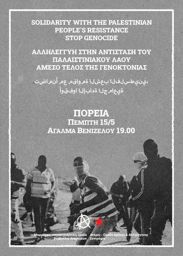 Οι Παλαιστίνιες δεν περιμένουν μοιρολατρικά τον θανατό τους, δεν δέχονται παθητικά την κλοπή της γης και των ζωών τους. Οι Παλαιστίνιοι αντιστέκονται μέσα από τις ένοπλες οργανώσεις τους, αντεπιτίθενται καθημέρινα με ό,τι μέσα έχουν, παραμένουν στα βομβαρδισμένα τους σπίτια, βάζουν ανάχωμα τα σώματά τους ενάντια στη λήθη και τον αφανισμό τους. Στη μάχη τους για να διεκδικήσουν τις ζωές τους και να διαδώσουν τον αγώνα τους, στους αγώνες των εκτοπισμένων Παλαιστινίων στις δυτικές πόλεις κόντρα στην καταστολή τους, στεκόμαστε αλληλέγγυα και ενισχύουμε τις φωνές τους. Να μη σιωπήσουμε. Να μην γίνουμε συναυτουργοί στη γενοκτονία. Να σαμποτάρουμε την πολεμική μηχανή της Ελλάδας και κάθε κράτους δολοφόνου που συντελεί ή συμμετέχει στο γενοκτονικό πόλεμο.