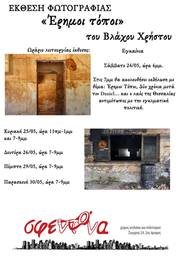 Σάββατο 24/5, 6μμ εγκαίνια και εκδήλωση με τίτλο «Έρημοι τόποι: 2 χρόνια μετά τον Daniel… και ο λαός της Θεσσαλίας αντιμέτωπος με την εγκληματική πολιτική».