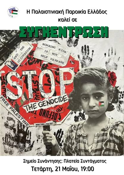 Πρωτοβουλία Συλλογικοτήτων / Ομάδων ενάντια στη συμμετοχή του ελληνικού κεφαλαίου στη Γενοκτονία του Παλαιστινιακού Λαού | Κάλεσμα στην συγκέντρωση στην πλατεία Συντάγματος την Τετάρτη 21 Μαίου στις 7μμ.