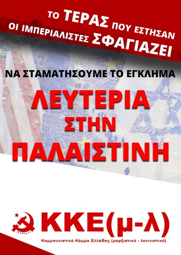 Δεν υπάρχει άλλος δρόμος για να αποτρέψουμε την εξόντωση του παλαιστινιακού λαού, το σφαγιασμό των λαών της Μέσης Ανατολής και τον παγκόσμιο όλεθρο που ανοίγεται μπροστά μας από ένα μαζικό αντιπολεμικό αντιιμπεριαλιστικό κίνημα, επιβάλλοντας την πλήρη απομόνωση του Ισραήλ από το ελληνικό κράτος. Για να ρίξουμε τις κυβερνήσεις των πολέμων και τους υπηρέτες τους. Για να ξηλώσουμε βάσεις και πυρηνικά. Για τη δικαίωση του μαρτυρικού και ηρωικού Παλαιστινιακού λαού, ώστε να αποκτήσει το δικό του ανεξάρτητο κράτος. Για έναν Διεθνισμό των εργατών και των λαών, στην κοινή πάλη για τον Σοσιαλισμό - μόνη πραγματική εγγύηση ενάντια στον εφιάλτη του πολέμου.