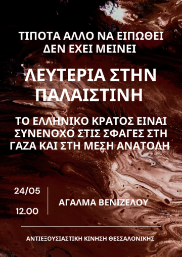 Το ΚΚΕ(μ-λ) καλεί στη Συγκέντρωση - διαδήλωση αλληλεγγύης στον Παλαιστινιακό λαό, που διοργανώνει ο συντονισμός για την Παλαιστίνη «Οργανώσεις- Συλλογικότητες της Θεσσαλονίκης» στην οποία συμμετέχουν μέλη της Παλαιστινιακής Κοινότητας της πόλης, το Σάββατο 24 Μάη, στις 12 το μεσημέρι στο Άγαλμα Βενιζέλου