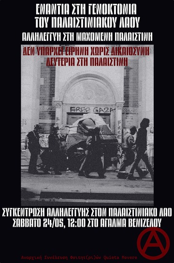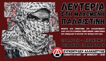 Για τους λόγους αυτούς, ο αγώνας ενάντια στη γενοκτονία των παλαιστινίων, ενάντια στους πολέμους του κεφαλαίου, η αλληλεγγύη στους/στις μετανάστ(ρι)ες και ο αντιφασιστικός αγώνας είναι κοινοί και μόνο μέσα από το συνδυαστικό πρίσμα τους μπορούμε να ανατιμήσουμε τις ζωές μας και να χτίσουμε ένα κόσμο αλληλεγγύης και ελευθερίας.