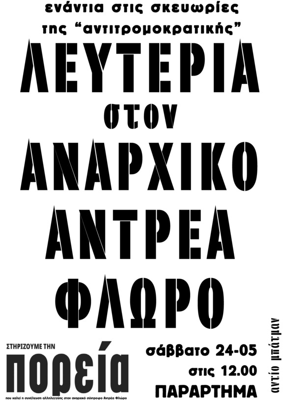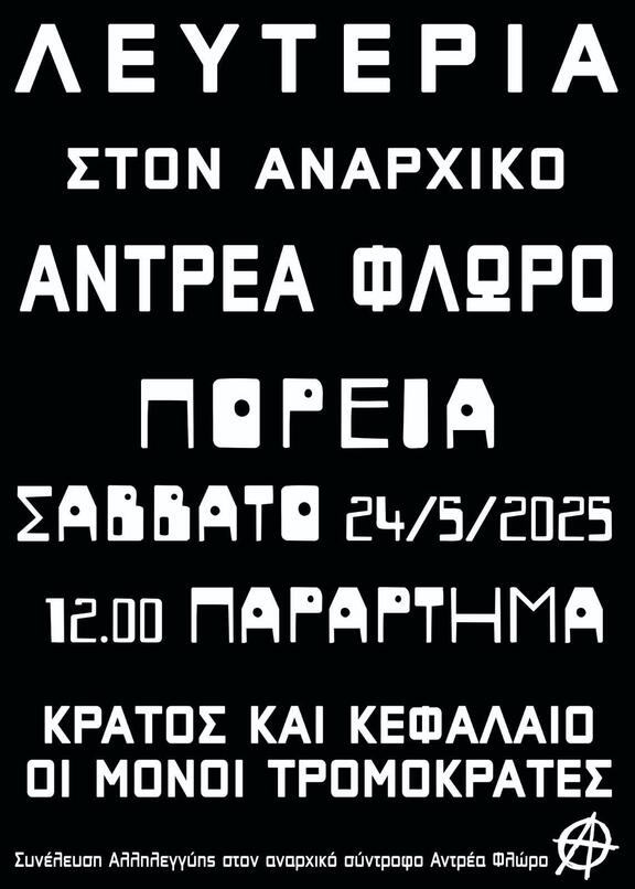 ΣΤΗΡΙΖΟΥΜΕ ΤΗ ΣΥΓΚΕΝΤΡΩΣΗ-ΠΟΡΕΙΑ ΓΙΑ ΤΟΝ ΑΝΑΡΧΙΚΟ ΑΓΩΝΙΣΤΗ ΑΝΤΡΕΑ ΦΛΩΡΟ ΤΟ ΣΑΒΒΑΤΟ 24/05 ΣΤΙΣ 12:00 ΣΤΗΝ ΚΑΤΑΛΗΨΗ ΠΑΡΑΡΤΗΜΑΤΟΣ