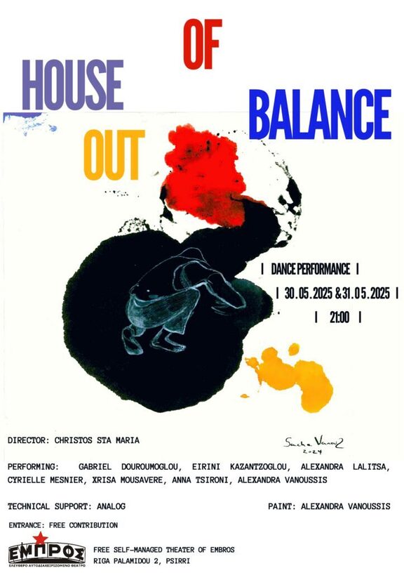 Το House out of Balance είναι μια θεατρική παράσταση χορού, η οποία χτίστηκε εξ ολοκλήρου στο ελεύθερο και αυτοδιαχειριζόμενο θέατρο Έμπρος, μια διαδικασία δημιουργίας στοχεύοντας την υιοθέτηση και προσέγγιση της αυτοοργάνωσης, απηχώντας τον τόπο απ' όπου ξεκίνησαν όλα.