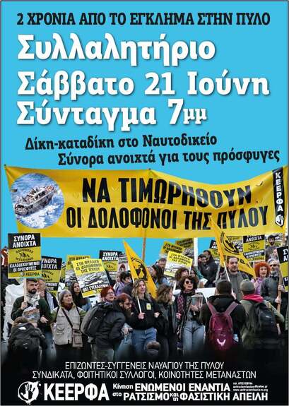 2 xρόνια από το έγκλημα της Πύλου. Συλλαλητήριο, Σάββατο 21 Ιούνη, Σύνταγμα, 7 μ.μ. Στη φυλακή οι δολοφόνοι της Πύλου. Δίκη-καταδίκη στο Ναυτοδικείο. Σύνορα ανοιχτά για την προσφυγιά.