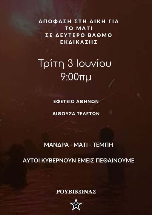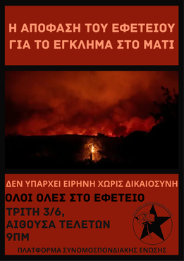 Η υπόθεση της φονικής πυρκαγιάς στο Μάτι τον Ιούλιο του 2018 εκδικάζεται σε δεύτερο βαθμό, όπου θα κριθεί και θα τελεσιδικήσει η εγκληματική και κακουργηματική ευθύνη μερικών εκ των υπεύθυνων του τραγικού αυτού κρατικού καπιταλιστικού εγκλήματος. Η έναρξη της τελικής διαδικασίας είναι την Τρίτη 3 Ιουνίου στο Εφετείο Αθηνών.