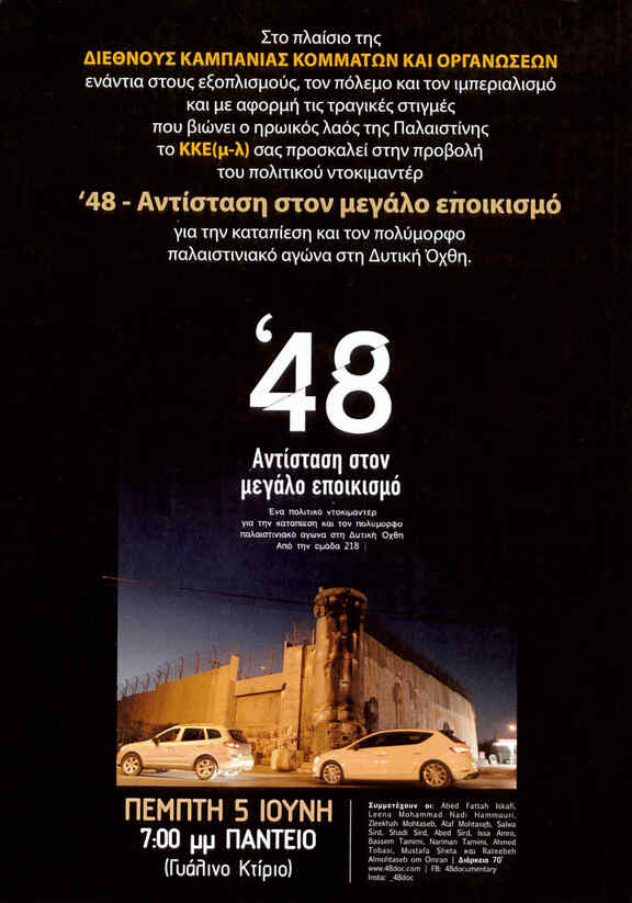 Στο πλαίσιο της διεθνούς καμπάνιας κομμάτων και οργανώσεων ενάντια στους εξοπλισμούς, τον πόλεμο και τον ιμπεριαλισμό και με αφορμή τις τραγικές στιγμές που βιώνει ο ηρωικός λαός της Παλαιστίνης το ΚΚΕ(μ-λ) σας προσκαλεί στην προβολή του πολιτικού ντοκιμαντέρ: '48 - Αντίσταση στο μεγάλο εποικισμό.
