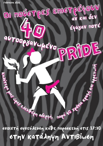 Επιλέγουμε αυτοοργανωμένο Pride και όχι θεσμικό γιατί θέλουμε να συνεχιστεί ως πολιτικός αγώνας και όχι μόνο σαν ένα φεστιβάλ στο οποίο η κυβέρνηση, οι εταιρίες και οι σπόνσορες θα επωφεληθούν με κάθε τρόπο. Συνδιαμορφώνοντας εμείς θέτουμε τα χαρακτηριστικά και τους όρους του Pride, συζητάμε για τις ανάγκες και τις επιθυμίες μας και δημιουργούμε συνθήκες λιγότερο αφόρητες για μας.