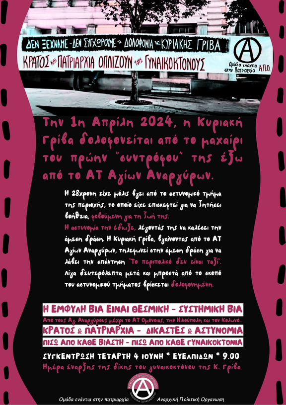 Την Τετάρτη 4 Ιουνίου, ξεκινάει η δίκη του γυναικοκτόνου της Κυριακής Γρίβα. Της 28χρονης, που το βράδυ της Δευτέρας 1/4/2024, μετέβη μαζί με φίλο της στο ΑΤ Αγίων Αναργύρων, ώστε να καταγγείλει παρακολούθηση από τον πρώην σύντροφό της, ο οποίος την είχε κακοποιήσει και στο παρελθόν. Είχε ζητήσει μάλιστα να την μεταφέρουν με το περιπολικό στο σπίτι της γιατί φοβόταν για τη ζωή της, για να λάβει την απάντηση εκ μέρους της αξιωματικού υπηρεσίας, ότι δεν υπήρχε κάποιο διαθέσιμο (!) και θα έπρεπε να καλέσει την Άμεση Δράση. Βγαίνοντας από το Α.Τ. η Κυριακή Γρίβα καλεί την άμεση δράση, η οποία δηλώνει ότι "το περιπολικό δεν είναι ταξί", λίγα δευτερόλεπτά μετά ο πρώην "σύντροφός" της, της επιτέθηκε με μαχαίρι και την δολοφόνησε, μπροστά στο σκοπό του αστυνομικού τμήματος.