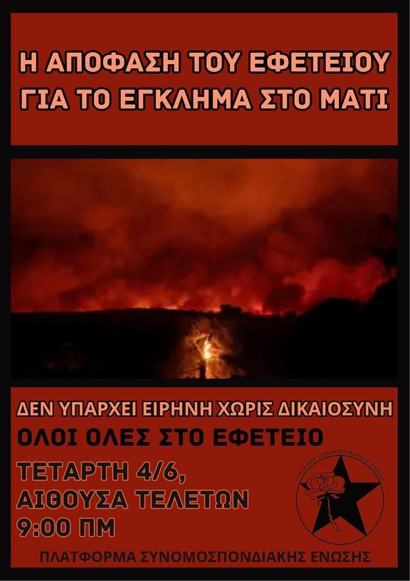 Η υπόθεση της φονικής πυρκαγιάς στο Μάτι τον Ιούλιο του 2018 εκδικάζεται σε δεύτερο βαθμό, όπου θα κριθεί και θα τελεσιδικήσει η εγκληματική και κακουργηματική ευθύνη μερικών εκ των υπεύθυνων του τραγικού αυτού κρατικού καπιταλιστικού εγκλήματος. Η συνέχεια της τελικής διαδικασίας είναι την Τετάρτη 4 Ιουνίου στο Εφετείο Αθηνών.