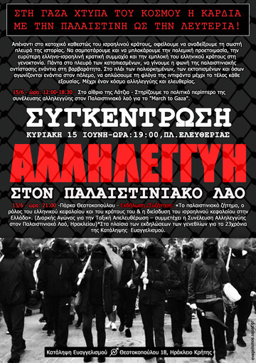 - Εκδήλωση - Συζήτηση: «Το παλαιστινιακό ζήτημα, ο ρόλος του ελληνικού κεφαλαίου και του κράτους του & η διείσδυση του ισραηλινού κεφαλαίου στην Ελλάδα». (Διαρκής Αγώνας για την Ταξική Απελευθέρωση - συμμετέχει η Συνέλευση Αλληλεγγύης στον Παλαιστινιακό Λαό Ηρακλείου).
