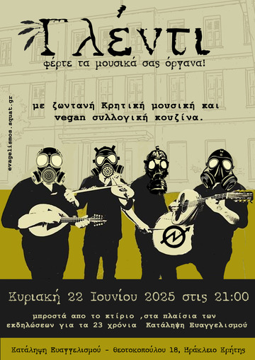- Γλέντι με ζωντανή Κρητική μουσική και vegan συλλογική κουζίνα.