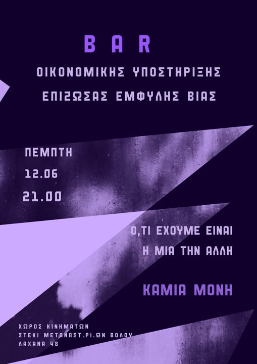 Την Πέμπτη 12.06.25 ώρα 21:00, το στέκι θα είναι ανοιχτό για bar οικονομικής υποστήριξης επιζώσας έμφυλης βίας