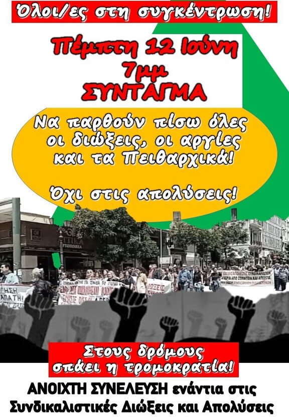 Η Ανοιχτή Συνέλευση Αγώνα ενάντια στις Συνδικαλιστικές Διώξεις και Απολύσεις καλεί την Πέμπτη 12 Ιούνη στις 7.00 μμ στο Σύνταγμα σε συγκέντρωση καταγγελίας των διώξεων και απολύσεων, της επίθεσης της αξιολόγησης και του νέου νόμου για τα πειθαρχικά και των σχεδίων για άρση μονιμότητας. Σωματεία, συλλογικότητες, κινήσεις γειτονιάς και φορείς συνεχίζουν στην κατεύθυνση οργάνωσης του αγώνα για να ανακληθούν όλες οι διώξεις, οι απολύσεις και τα πειθαρχικά!
