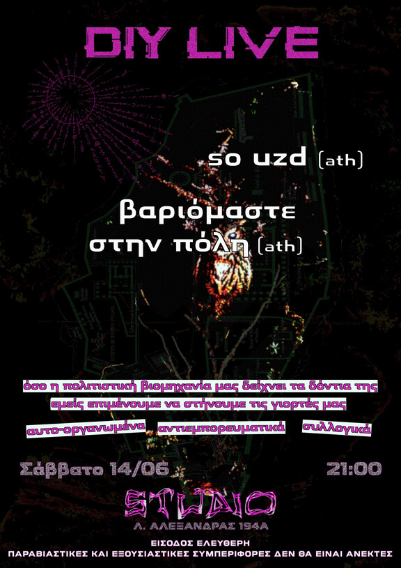 Αυτό το Σάββατο 14/06 στήνουμε ένα αυτοοργανωμένο λαιβ μαζί με so uzd και βαριόμαστε στην πόλη, στο υπόγειο της Λ. Αλεξάνδρας 194Α.