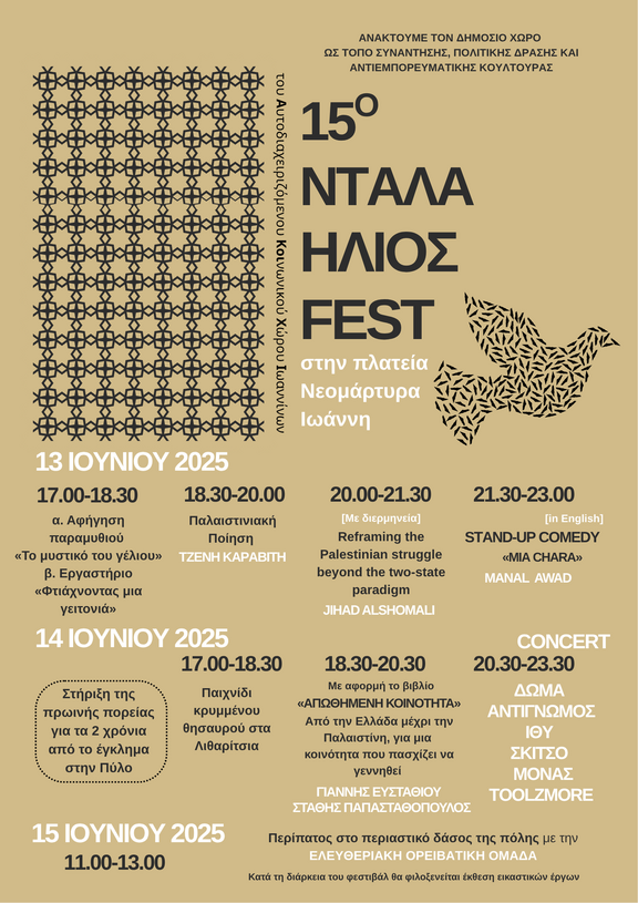 Το Ντάλα Ήλιος θα πραγματοποιηθεί για 15η χρονιά φέτος. Γεννήθηκε και συνεχίζει, περαν των άλλων, ως μία σταθερή προσπάθεια επανανοηματοδότησης των δημόσιων χώρων. Φέτος αποφασίσαμε να κάνουμε για πρώτη φορά βάση και σημείο αναφοράς την πλατεία μας, την πλατεία Νεομάρτυρα Ιωάννη.