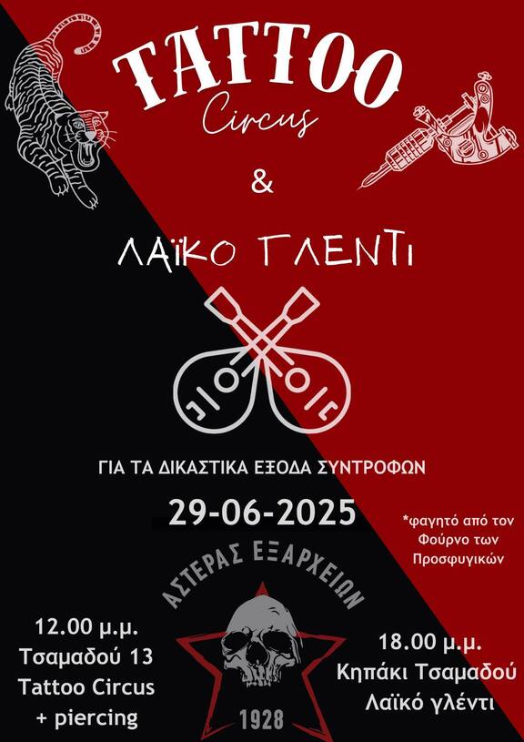 Με την ασυδοσία των μπάτσων, τη στήριξη των δικαστών και την προπαγάνδα από τα πληρωμένα παπαγαλάκια των μέσων μαζικής εξαπάτησης, προσπαθούν να βάλουν στο περιθώριο κάθε φωνή αντίστασης. Όπλα τους είναι οι φυλακίσεις, η οικονομική εξουθένωση και η συκοφάντηση των αγωνιστών. Εμείς από την άλλη πλευρά δεν αφήνουμε όσους αγωνίζονται όμηρους στα χέρια τους. Τους στηρίζουμε με οποιονδήποτε τρόπο. Έτσι και αυτή την Κυριακή σας καλούμε στην αυτοοργανωμένη εκδήλωση μας, με tattoo circus, μπαρ, φαγητό και λαϊκό γλέντι για να δηλώσουμε έμπρακτα τη στήριξη μας. Για να μην τους αφήσουμε μόνους στο δύσκολο αγώνα τους.