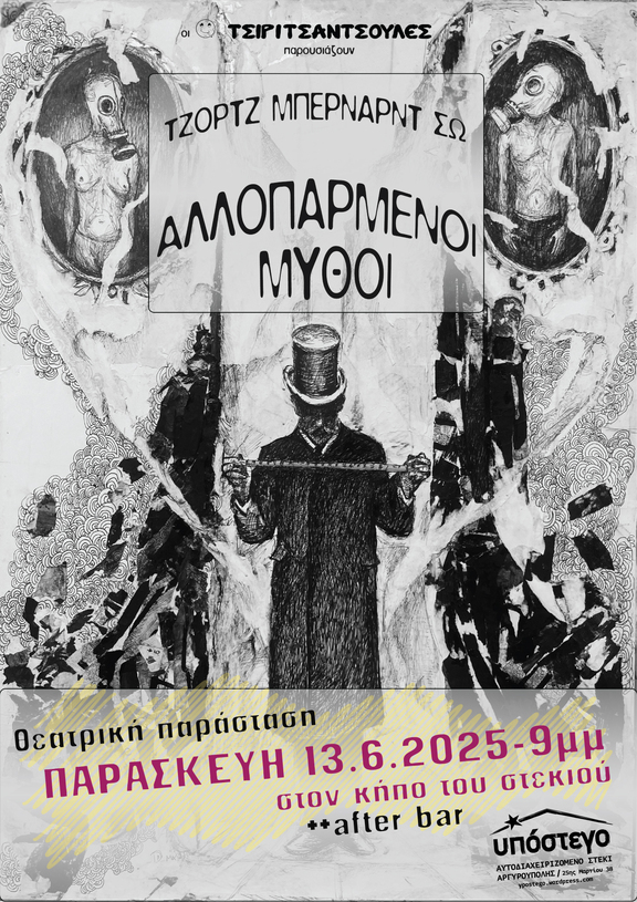 Την Παρασκευή 13.6.2025 στις 21:00 στον κήπο του Υποστέγου οι Τσιριτσάντσουλες κλείνουν 25 χρόνια ζωής και παρουσιάζουν τη θεατρική παράσταση Αλλοπαρμένοι Μύθοι του Τζορτζ Μπέρναρντ Σω.