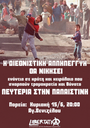 Εμείς από τη πλευρά μας δεν μπορούμε παρά να είμαστε αλληλέγγυοι με τον παλαιστινιακό λαό που συνεχίζει να μάχεται σκληρά κι επίμονα για την επιβίωση, την αξιοπρέπεια και την ελευθερία του με μόνους συμμάχους του τους αγωνιζόμενους σε ολόκληρο τον κόσμο. Αυτά τα στοιχεία του αγώνα τους θέλουμε να αναδείξουμε ως αναρχικοί, τη δυνατότητα του κατακτημένου να αντεπιτίθεται στον πανίσχυρο κατακτητή, την ικανότητα του φτωχού και του αποκλεισμένου να εξεγείρεται κάτω κι από τις πιο βάρβαρες συνθήκες. Η διεθνής αλληλεγγύη θέλουμε να δημιουργήσει ρήγματα στο εσωτερικό των επιτιθέμενων κυρίαρχων φέρνοντας στο προσκήνιο τη δική μας ιστορία, την ιστορία των αγώνων των από τα κάτω που κόντρα σε όλους τους καιρούς, δημιουργούν τη ζώσα πραγματικότητα της ελευθερίας και της αλληλεγγύης, αποτελώντας το μόνο πραγματικό ανάχωμα στην επέλαση του σύγχρονου ολοκληρωτισμού. Μέχρι τη συνολική απελευθέρωση των λαών από τα δεσμά του κράτους και του κεφάλαιου, μέχρι την κοινωνική επανάσταση για έναν κόσμο ισότητας, αλληλεγγύης και ελευθερίας.