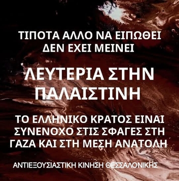 Σε αυτή τη συγκυρία θεωρούμε ότι οι δράσεις αλληλεγγύης στον Παλαιστινιακό λαό οφείλουν να πυκνώσουν. Το καθήκον που έχουμε είναι να καταδείξουμε την ευθύνη του ελληνικού κράτους στη γενοκτονία, να εναντιωθούμε στην πολεμική/τεχνολογική συνεργασία με το Ισραηλινό κράτος. Σύσσωμα τα δυτικά κράτη, η ΕΕ και το ΝΑΤΟ στηρίζουν έμπρακτα την γενοκτονία παρέχοντας πολιτική και υλική στήριξη, την ίδια στιγμή που και η Ρωσία και η Κίνα εξοπλίζουν με drones τον Ισραηλινό στρατό.Το ελληνικό κρατος αποτελεί κόμβο στους σχεδιασμούς του ΝΑΤΟ παρέχοντας στρατιωτικές βάσεις και δημιουργώντας στρατηγείο στη Λάρισα κατά των Χούθις στην Υεμένη. Συμμετέχει σε αιματοβαμμένες συμφωνίες (με χαρακτηριστικό παράδειγμα το λεγόμενο "καλωδιο" για την ηλεκτρική διασύνδεσή του με το Ισραήλ), γενοκτονίες και διακρατικούς πολέμους στη Μεση Ανατολή λαδώνοντας τα γρανάζια του δικού του καπιταλιστικού μηχανισμού. Αυτό σημαίνει ότι θα συνεχίσει και θα εντείνει τον πολέμο που διεξάγει τόσο στον εξωτερικό αλλά όσο και στον εσωτερικό εχθρό του με περαιτέρω καταστολή, εκμετάλλευση και βαρβαρότητα για τα πιο υποτιμημένα ταξικα και κοινωνικά κομμάτια οπως ειναι οι μετανάστ(ρι)ες και οι ρομά.