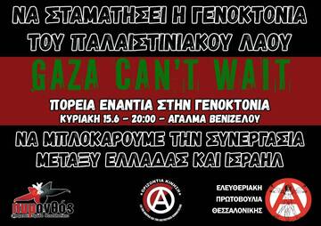 - Να αναγκάσουμε το ελληνικό κράτος να σταματήσει τη συνέργεια του στη γενοκτονία των Παλαιστινίων. Να σταματήσουμε την πολεμική τους μηχανή.