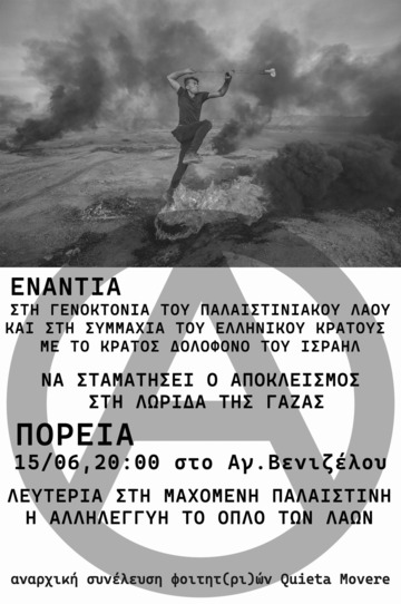 Οφείλουμε, ως άνθρωποι και ως αγωνιστές/ριες να αντιταχθούμε ενεργά απέναντι σε αυτή την σύγχρονη φρίκη του κρατικού-καπιταλιστικού ολοκληρωτισμού, στην οποία εμπλέκονται άμεσα και κύρια οι άρχουσες τάξεις και τα κράτη του δυτικού μπλοκ εξουσίας, τα οποία βρίσκονται σε πλήρη ευθυγράμμιση με το ισραηλινό κράτος και τα συμφέροντά του. Σε αυτό το άρμα του θανάτου για τους καταπιεσμένους βρίσκεται σφιχτά προσδεμένο και το ελληνικό κράτος το οποίο έχει αναβαθμίσει σε στρατηγική θέση την επίσημη συνεργασία (οικονομική, στρατιωτική) με το ισραηλινό κράτος, τροφοδοτώντας το και καλύπτοντάς το πολιτικά, διπλωματικά και υλικά απέναντι στην παγκόσμια ανθρωπότητα.