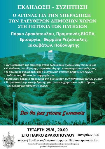 Συζητάμε τρόπους αντιμετώπισης της επίθεσης που δέχονται οι ελεύθεροι χώροι στη γειτονιά των Πατησίων και τον κίνδυνο οικοδόμησης, τσιμεντοποίησης , εμπορευματοποίησής τους.