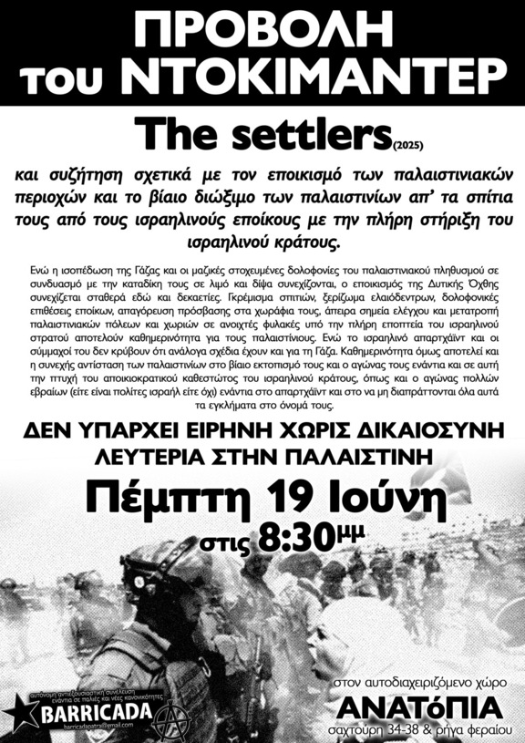 …και συζήτηση σχετικά με τον εποικισμό της Παλαιστίνης από το ισραηλινό απαρτχάϊντ καθεστώς. Η εκδήλωση γίνεται από την αυτόνομη αντιεξουσιαστική συνέλευση ενάντια σε παλιές και νέες κανονικότητες BARRICADA.