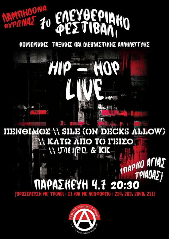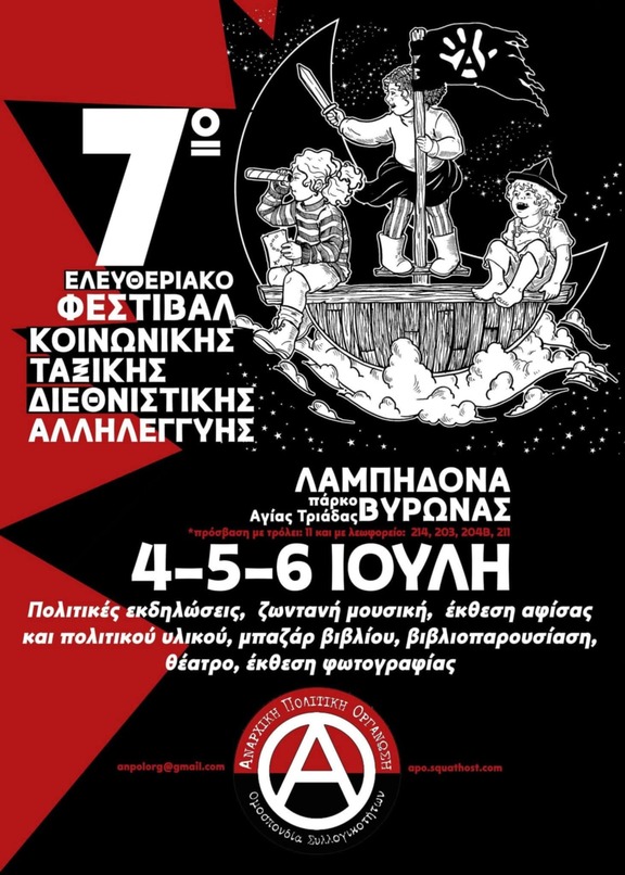 Στα πλαίσια του 7ου Ελευθεριακου Φεστιβάλ κοινωνικής ταξικής και διεθνιστικής αλληλεγγύης της Αναρχικής πολιτικής οργάνωσης - Ομοσπονδίας συλλογικοτήτων που διοργανώνεται στις 4-5-6 Ιούλη στο Πάρκο Αγιας Τριάδας - Λαμπηδονα (Βυρωνας)