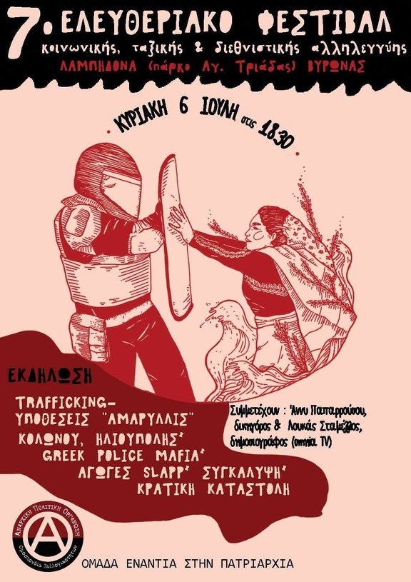 Στα πλαίσια του 7ου Ελευθεριακου Φεστιβάλ κοινωνικής ταξικής και διεθνιστικής αλληλεγγύης της Αναρχικής πολιτικής οργάνωσης - Ομοσπονδίας συλλογικοτήτων που διοργανώνεται στις 4-5-6 Ιούλη στο Πάρκο Αγιας Τριάδας - Λαμπηδονα (Βυρωνας)