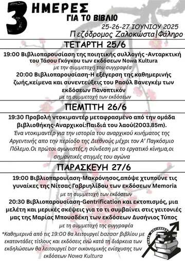 στον πεζόδρομο Ζαλοκώστα, δίπλα από το Ελευθεριακό Στέκι Victoire (Aγίας Τριάδος 28 & Γεωργίου Κωνσταντινίδη, Φάληρο), 25-26-27 Ιούνη