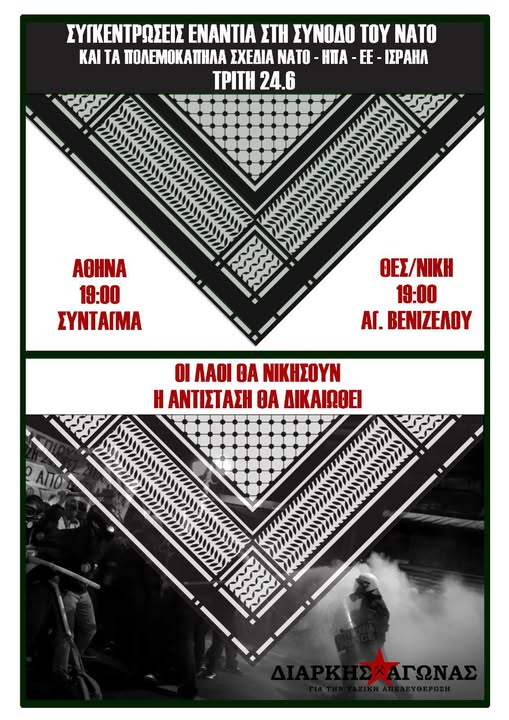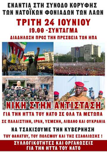 Ετήσια Σύνοδος ΝΑΤΟ, 24-25 Ιουνίου - ΝΑ ΗΤΤΗΘΟΥΝ οι Πολεμοκάπηλοι του ΝΑΤΟ & οι Σιωνιστές σφαγείς του Ισραήλ - Συγκέντρωση 24/6, 19:00 Σύνταγμα (πορεία στην αμερικάνικη πρεσβεία)