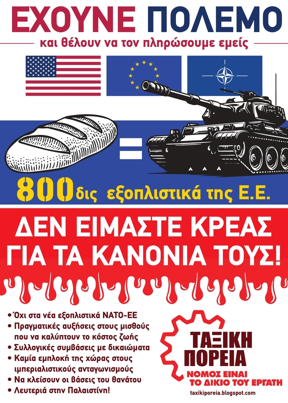 Όχι άλλες θυσίες για τα κέρδη τους! Δεν θα γίνουμε κρέας για τα κανόνια τους! Καμία αύξηση στον πολεμικό προϋπολογισμό.