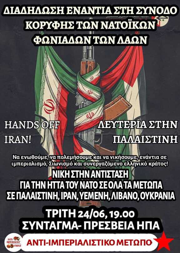 Την Τρίτη 24 Ιουνίου, συγχρονιζόμαστε με το αντινατοϊκό αντιπολεμικό κίνημα που θα διαδηλώνει μαζικά στη Χάγη, και ενώνουμε τις φωνές και τις γροθιές μας με τους λαούς και τα κινήματα όλου του κόσμου για τη Λευτεριά της Παλαιστίνης και των λαών της Μέσης Ανατολής και για τη διακοπή κάθε σχέσης με τους γενοκτόνους φονιάδες ΗΠΑ ΝΑΤΟ ΕΕ Ισραήλ, γνωρίζοντας καλά ότι αυτό μόνο με ένα πραγματικό λαϊκό ταξικό ξεσηκωμό μπορεί να πραγματοποιηθεί.