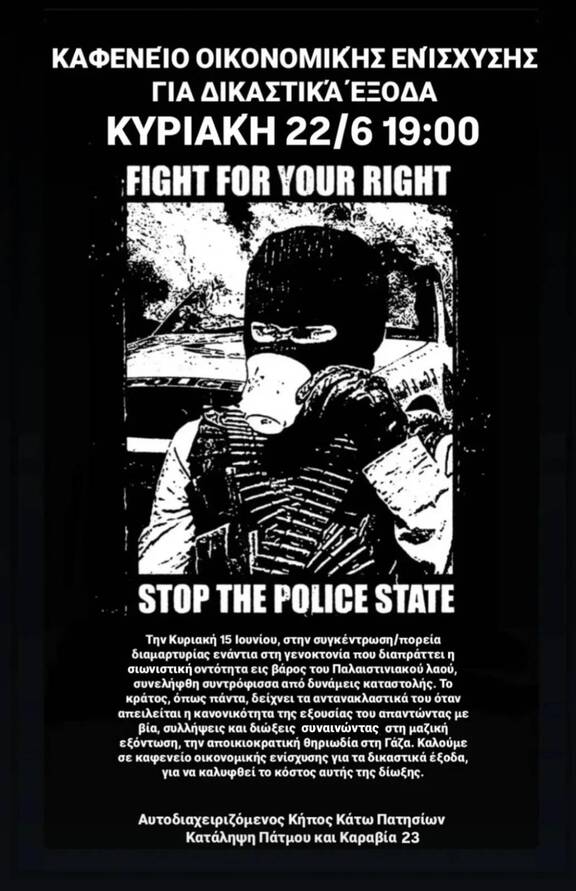 Καφενείο οικονομικής ενίσχυσης για δικαστικά έξοδα συλληφθείσας στην πορεία αλληλεγγύης στην Γάζα