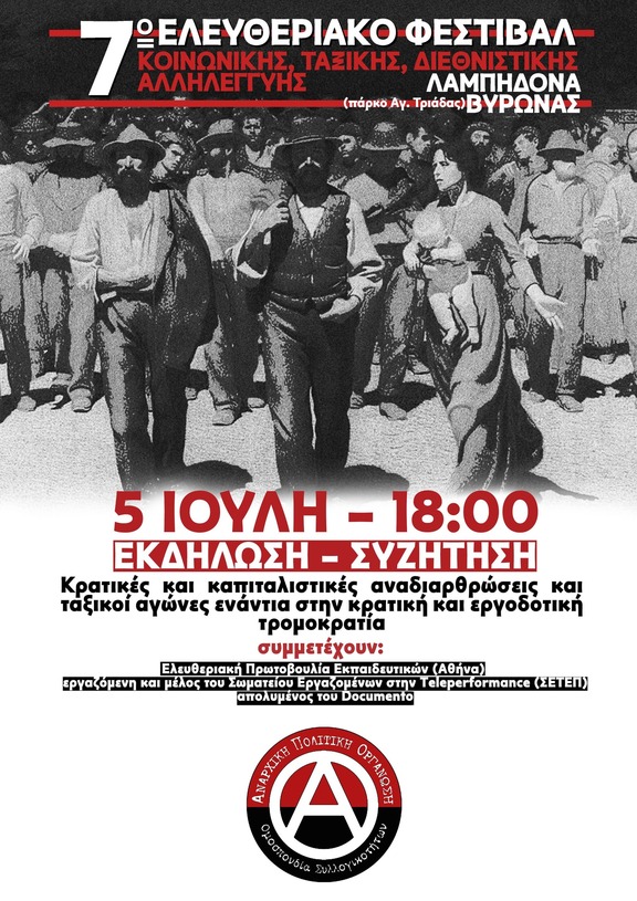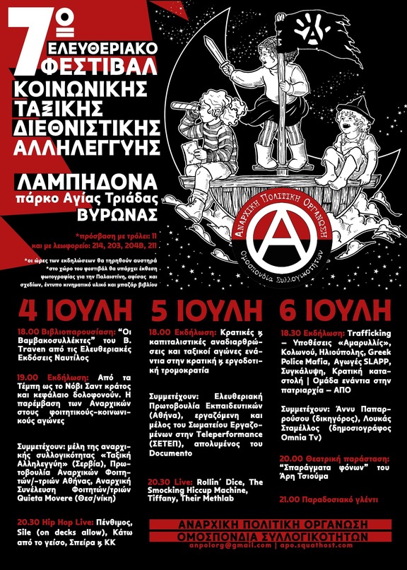 Στα πλαίσια του 7ου Ελευθεριακου Φεστιβάλ κοινωνικής ταξικής και διεθνιστικής αλληλεγγύης της Αναρχικής πολιτικής οργάνωσης - Ομοσπονδίας συλλογικοτήτων που διοργανώνεται στις 4-5-6 Ιούλη στο Πάρκο Αγιας Τριάδας - Λαμπηδονα (Βυρωνας)