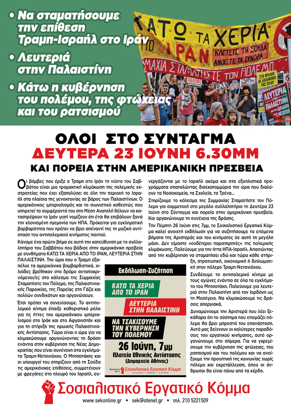• Να σταματήσουμε την επίθεση Τραμπ-Ισραήλ στο Ιράν • Λευτεριά στην Παλαιστίνη • Κάτω η κυβέρνηση του πολέμου, της φτώχειας και του ρατσισμού - Σύνταγμα 23/6, 6.30μμ
