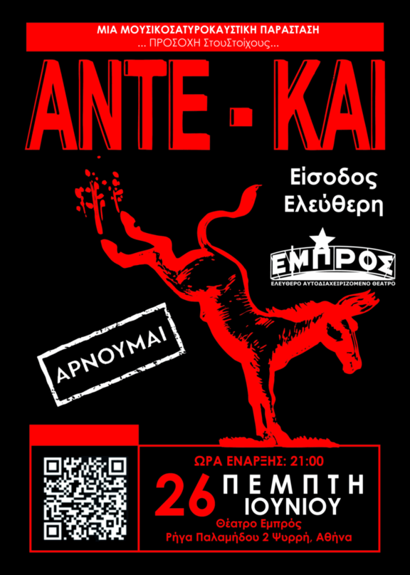 Το ροκ γκρουπ των ΑΝΤΕ-ΚΑΙ θα εμφανιστεί στις 26 Ιουνίου και ώρα 21:00 σε μια μουσικό-σατιρική παράσταση στο Ελεύθερο Αυτοδιαχειριζόμενο ΕΜΠΡΟΣ, οδός Ρήγα Παλαμήδου 2, Ψυρρή Αθήνα.