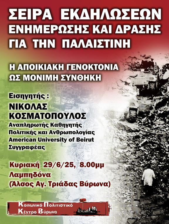 Tην Κυριακή 29/6/25 στις 8.00μμ, στην Λαμπηδόνα (άλσος Αγ. Τριάδας Βύρωνα), θα μας μιλήσει ο Νικόλας Κοσματόπουλος (Αναπληρωτής Καθηγητής Πολιτικής και Ανθρωπολογίας American University of Beirut, συγγραφέας και μέλος του Decolonize Hellas), με θέμα: «Η αποικιακή γενοκτονία ως μόνιμη συνθήκη». Θα ακολουθήσει συζήτηση.