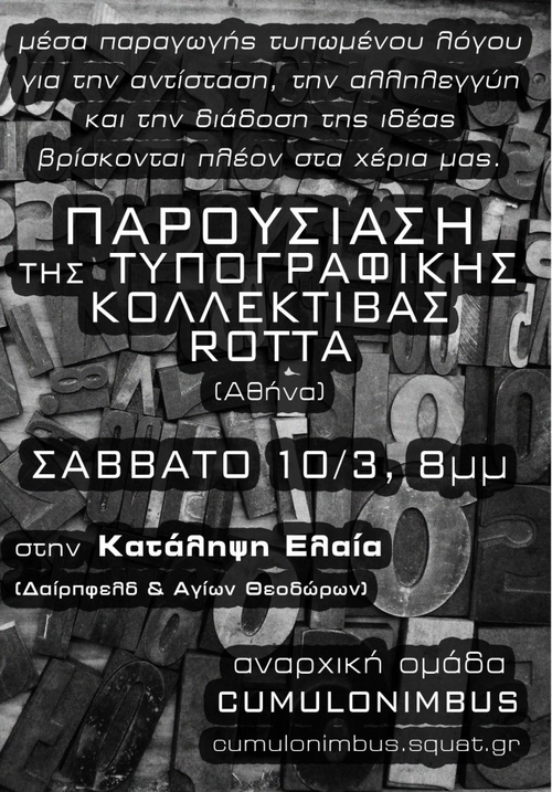 Παρουσίαση της τυπογραφικής κολλεκτίβας ROTTA(Αθήνα) . θα ακολουθήσει συζήτηση.