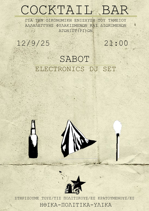 Cocktail bar + electronics dj set για την οικονομική ενισχύση του ταμείου αλληλεγγύης φυλακισμένων και διωκόμενων αγωνιστ(ρι)ών