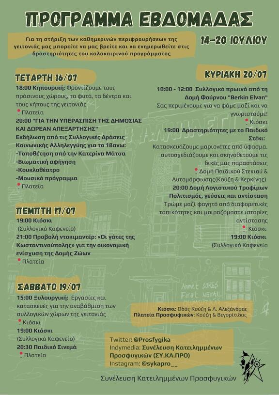 Το καλοκαιρινό πρόγραμμα Ιουλίου της Κοινότητας Κατειλημμένων Προσφυγικών μπορεί να βρεθεί εδώ: https://athens.indymedia.org/post/1636990/