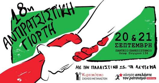 The 18th Anti-Racist Celebration will take place on the weekend of 20 and 21 September 2025 at Panteion University (Syngrou Avenue 136). For one more year, the festival of the Sunday School for Immigrants and the Movement "Deport Racism" was called to overcome indirect and direct blockades of University and public spaces, which are increasing year by year. Nevertheless, we are pleased to announce this year's venue for our anti-racist celebration. A great celebration of coexistence and culture. A meeting of resistance and demand for a world without war, racism and poverty. Armed with solidarity and common struggle for a life of justice and dignity.