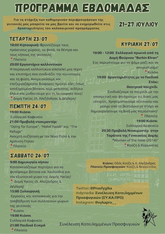 Το καλοκαιρινό πρόγραμμα Ιουλίου της Κοινότητας Κατειλημμένων Προσφυγικών μπορεί να βρεθεί εδώ: https://athens.indymedia.org/post/1636990/